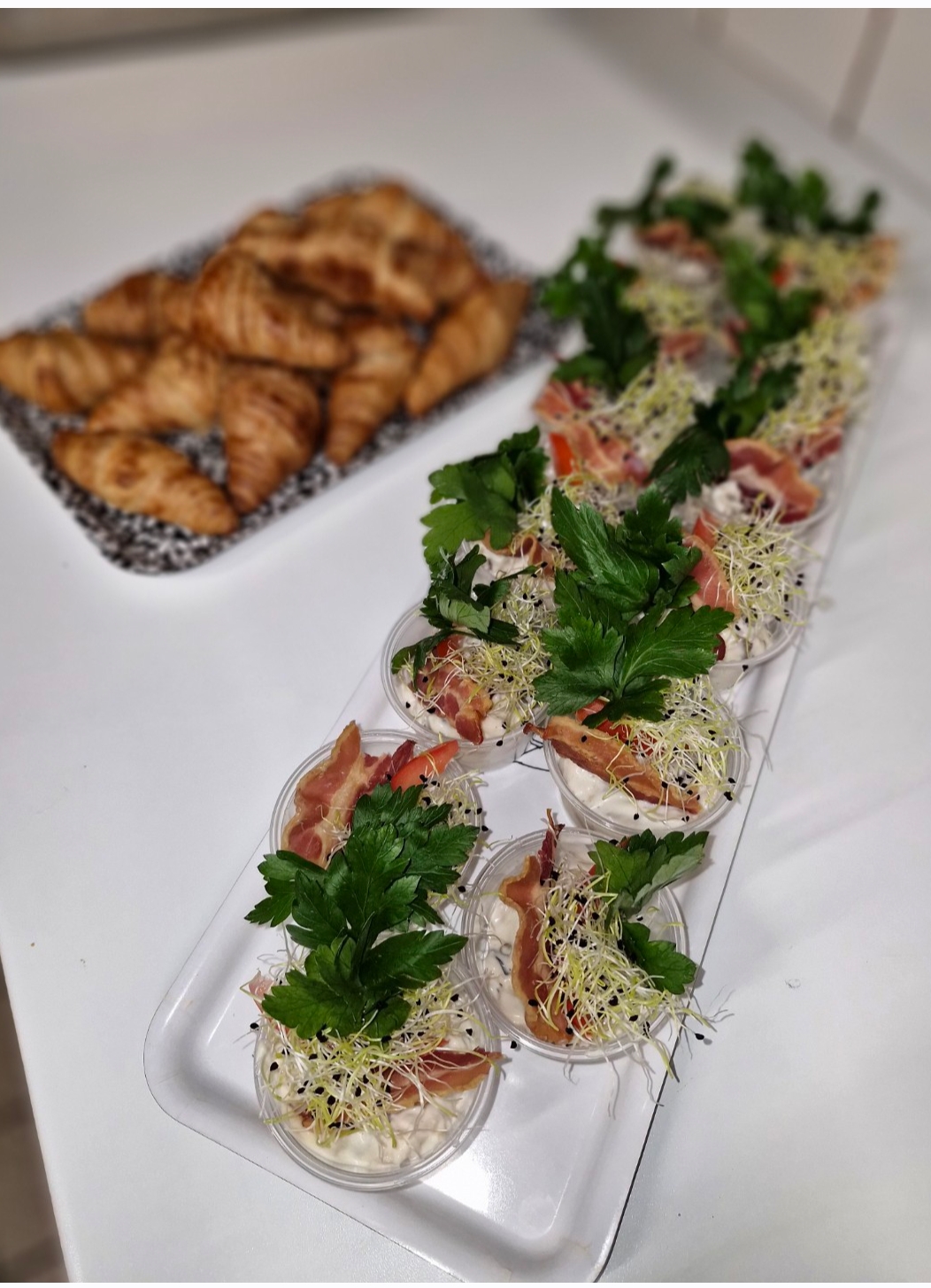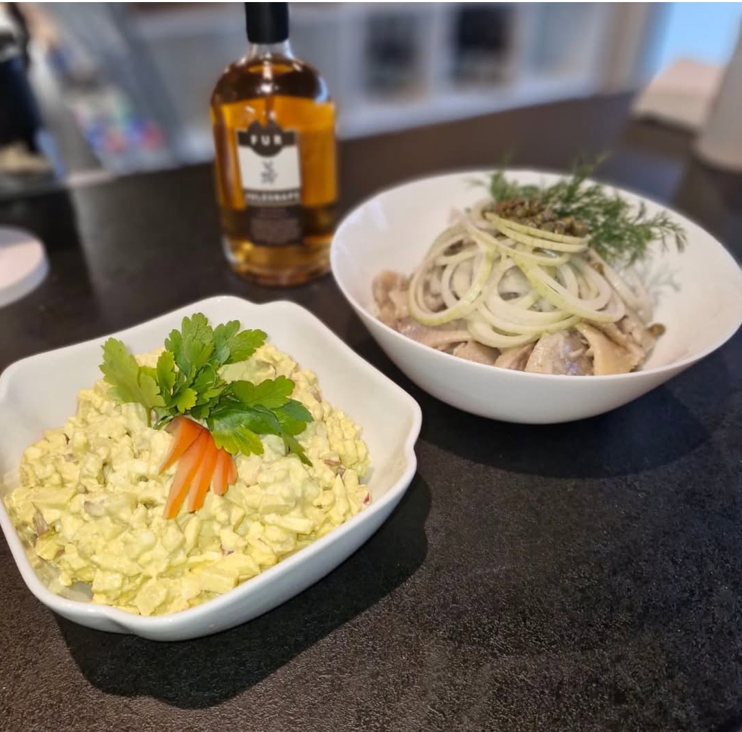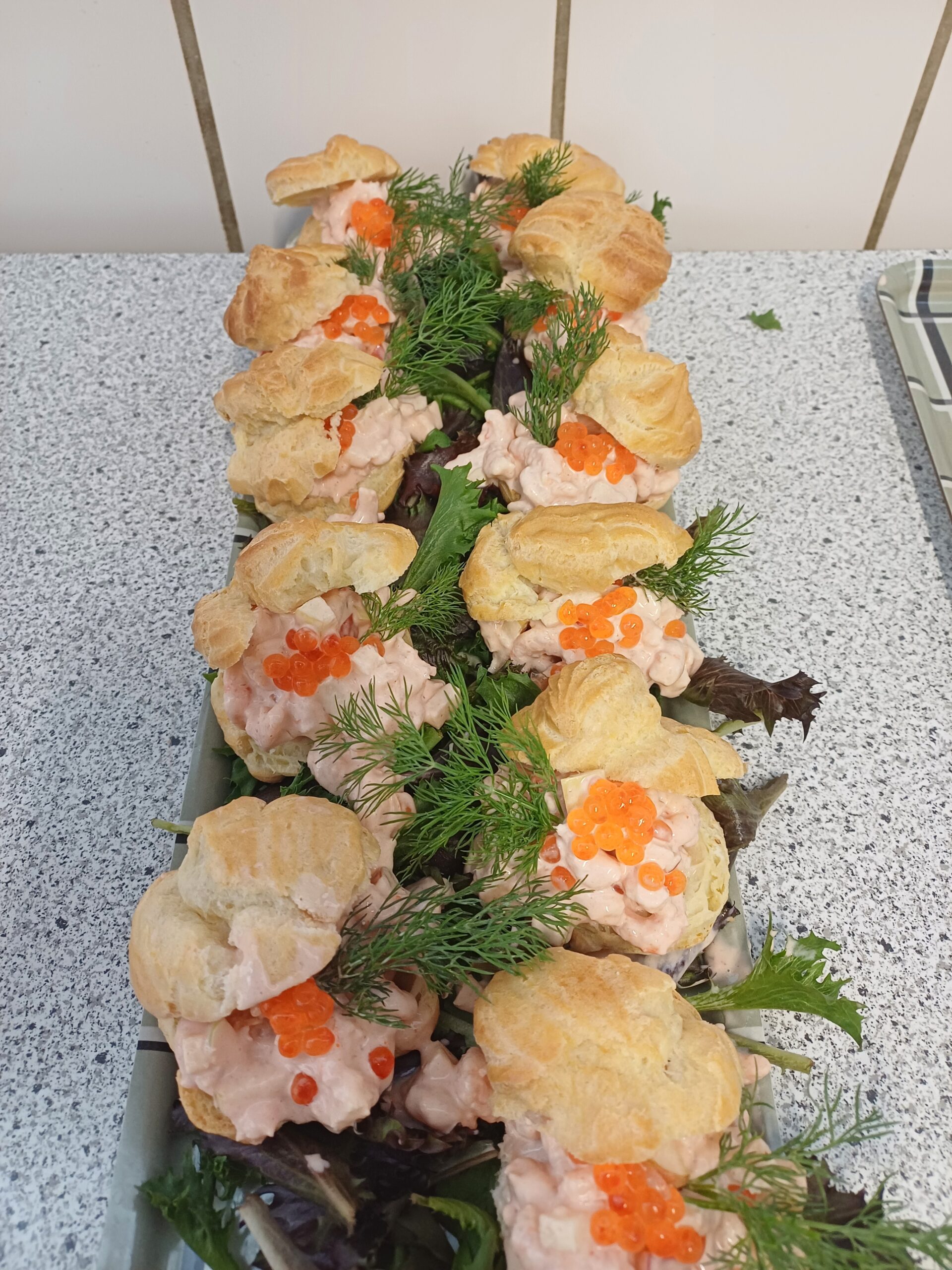 – Rejer med mayo og æg, låg med rejemousse på blinis.