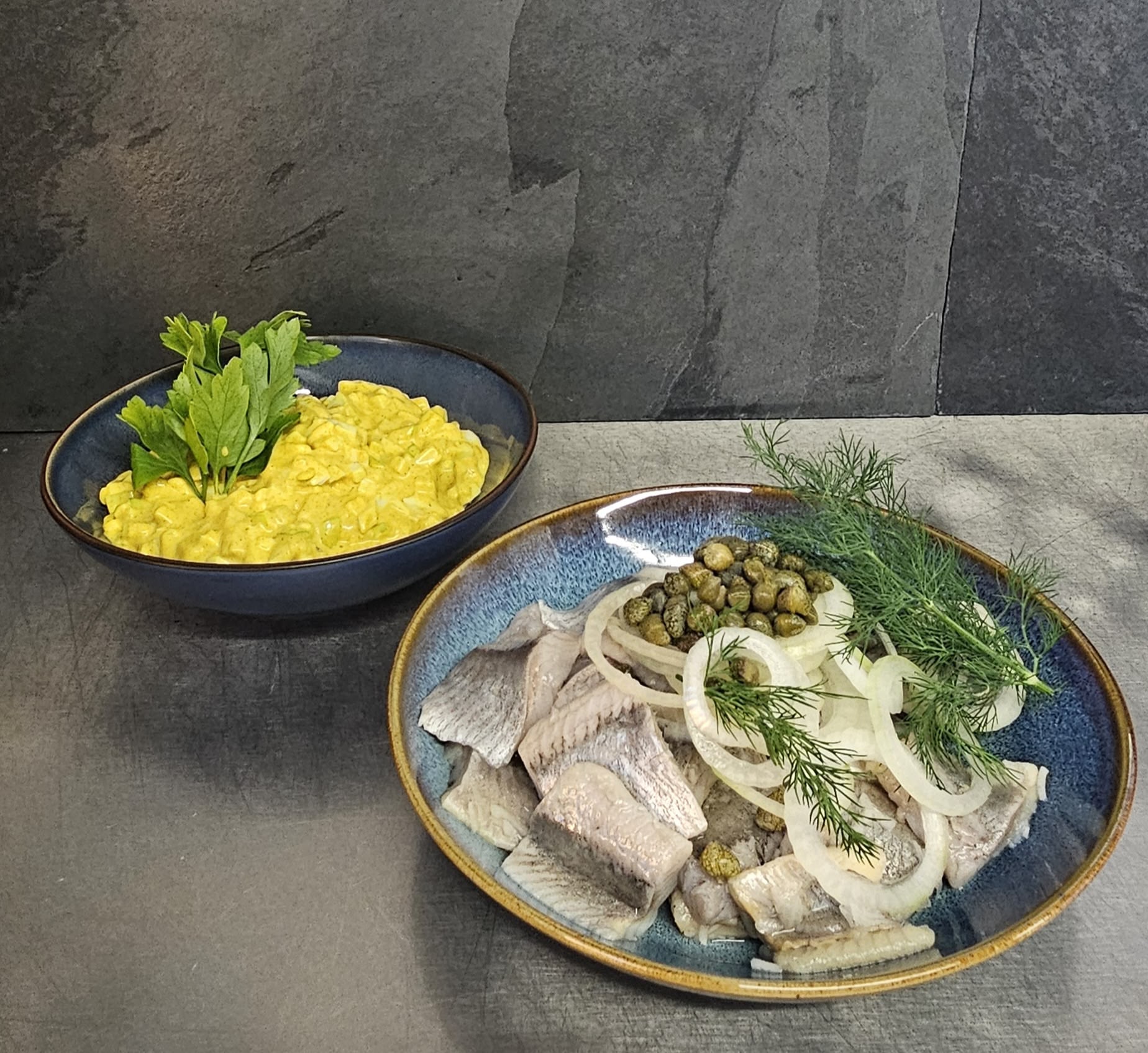 – Marinerede sild M/karrysalat.