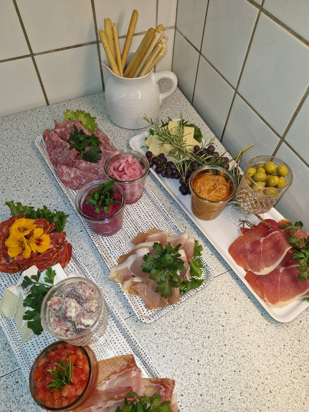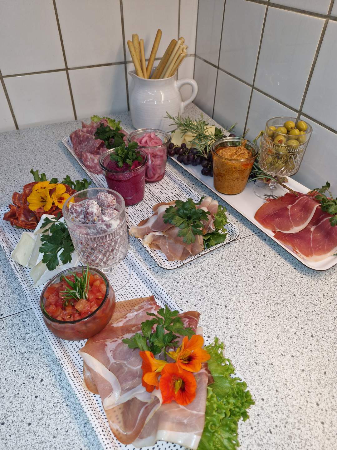 Forskellige oste og tilbehør (Pesto, oliven, soltørrede tomater osv.)